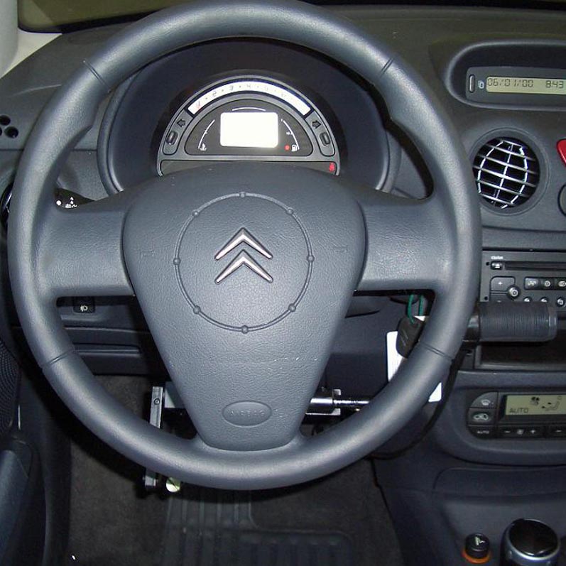 Este sistema integral es la adaptación más económica y eficiente para realizar las tres funciones de conducción esenciales (embragar, frenar y acelerar) utilizando únicamente la mano derecha. Agrupa todos los controles en un mando único y fiable, ideal para conductores con pérdida funcional total en las extremidades inferiores.